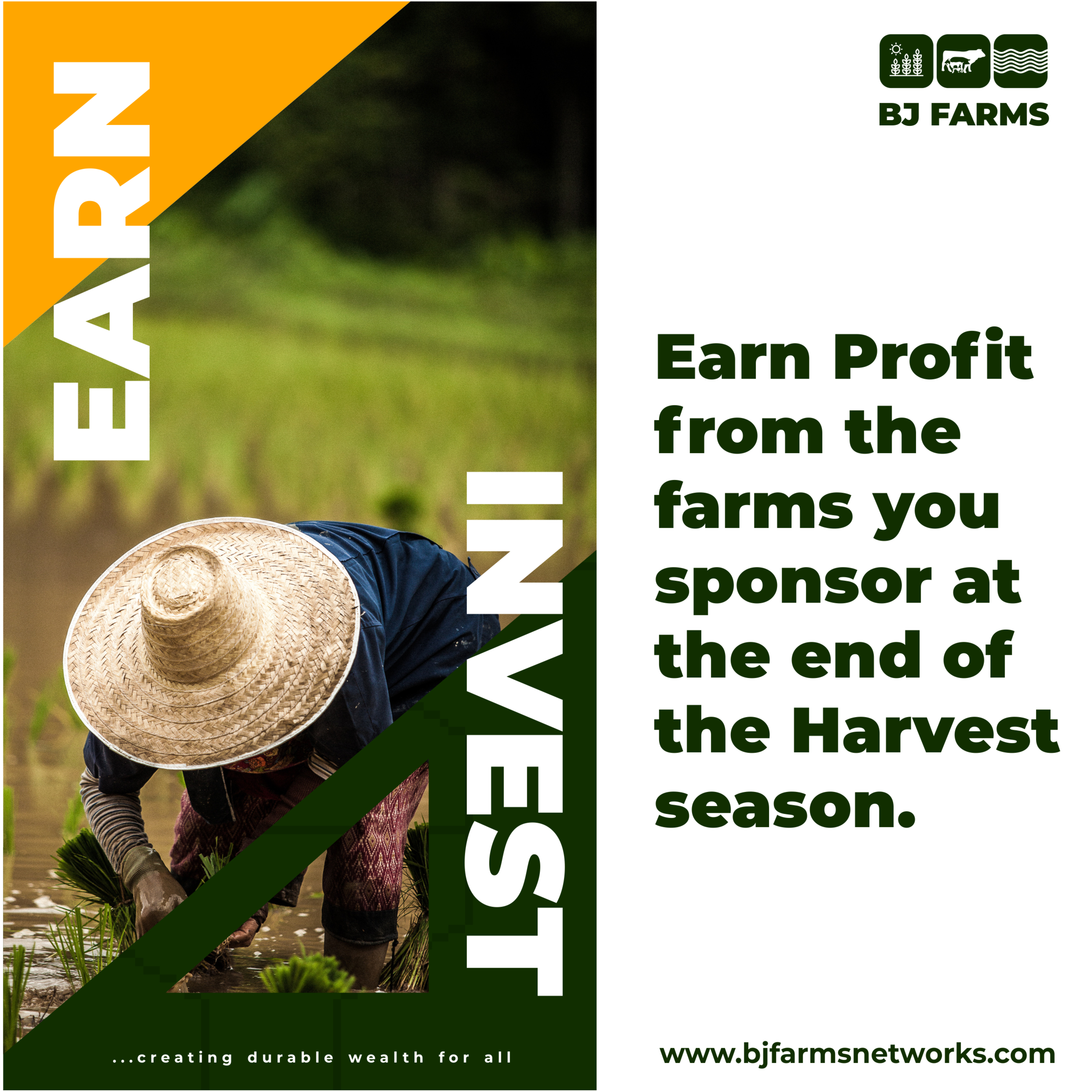 BJ Farms provides an alternative mode of online investment for “Farms Sponsor/Investors” where they can make “exciting returns” on their investment while also impacting the lives of small holder’s farmers and their family. BJ Farms gives all interested “Farms Sponsors” the opportunity to partner and sponsor real lucrative farms and Agricultural projects via our mobile and web platforms directly from the convenience of their homes and offices.